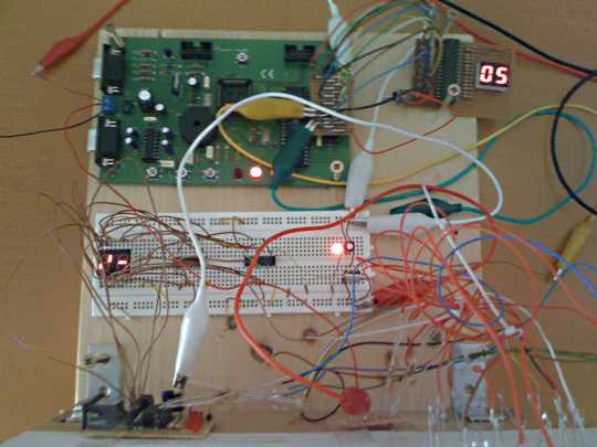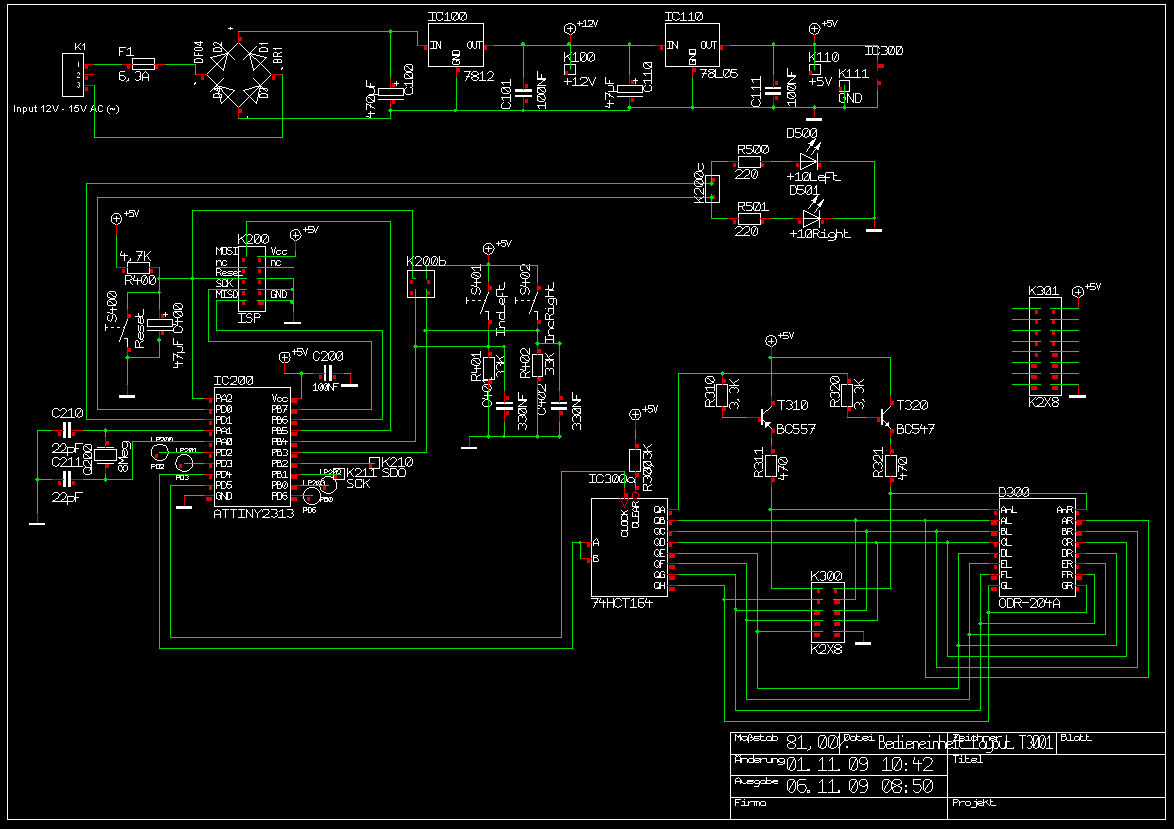 Zur Ansteuerung der LEDs soll ein AVR-Controller mit entsprechender Peripherie-Beschaltung verwendet werden. Insbesondere in der erste Ausbauvariante („kabelgebunden“) ist darauf zu achten, dass die Anzahl erforderlicher Leitungen zwischen Bedien- und Anzeigeeinheit niedrig gehalten wird. Aus diesem Grund sollen die Daten zur Ansteuerung der LEDs seriell übertragen und die Segmente per Schieberegister angesteuert werden.