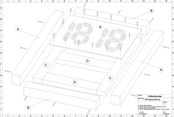 Die Anzeigeeinheit besteht aus einem Rahmen, einer Platte zur Aufnahme der LEDs auf der Frontseite und der Elektronik auf der Rückseite, einer rückseitigen Abdeckung, einer Acrylglasplatte zur vorderseitigen Abdeckung.