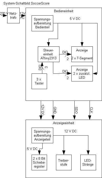 Mit Hilfe eines / zweier AVR Controller soll eine Anzeige von Fußballpunkteständen aufgebaut werden. Bei der Anzeige handelt es sich um eine großflächige Anzeige, die 7-Segment Darstellung durch LEDs nachahmt und auf dem Gelände des SV-Viktoria Lippstadt angebracht werden soll.
