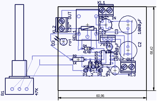 Die Schaltung ist bis auf LED und Poti komplett auf Lochraster aufgebaut, weshalb ich versucht habe die Leiterbahnen möglichst rechtwinkelig zu halten. LED und Poti sind per Stecklsieten angebunden und im Deckel verschraubt bzw. geklebt.