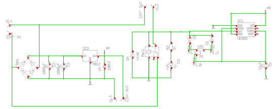 Die Schaltung wird mit einem 60 VA Trafo versorgt, den ich noch von einer Halogenlampen-Installation übrig hatte. Die Eingangsspannung ist eine Wechselspannung, die sowohl die Schaltung versorgt, als auch die Heizplatten. Ein Brückengleichrichter und zwei Elkos machen daraus eine Gleichspannung. Die Gleichspannung wird vom NE555 Universaltimer in eine PWM gewandelt. Diese PWM steuert das Relais. Das Relais schaltet eine Phase der 12V Eingangsspannung. Die ist parallel zum Relais geschaltet und gibt eine optische Rückmeldung (obwohl das Relais natürlich auch deutlich hörbar ist :-). Zusätzlich stehen die 12V Gleichspannung noch an Klemme 3 zur Verfügung (optional).